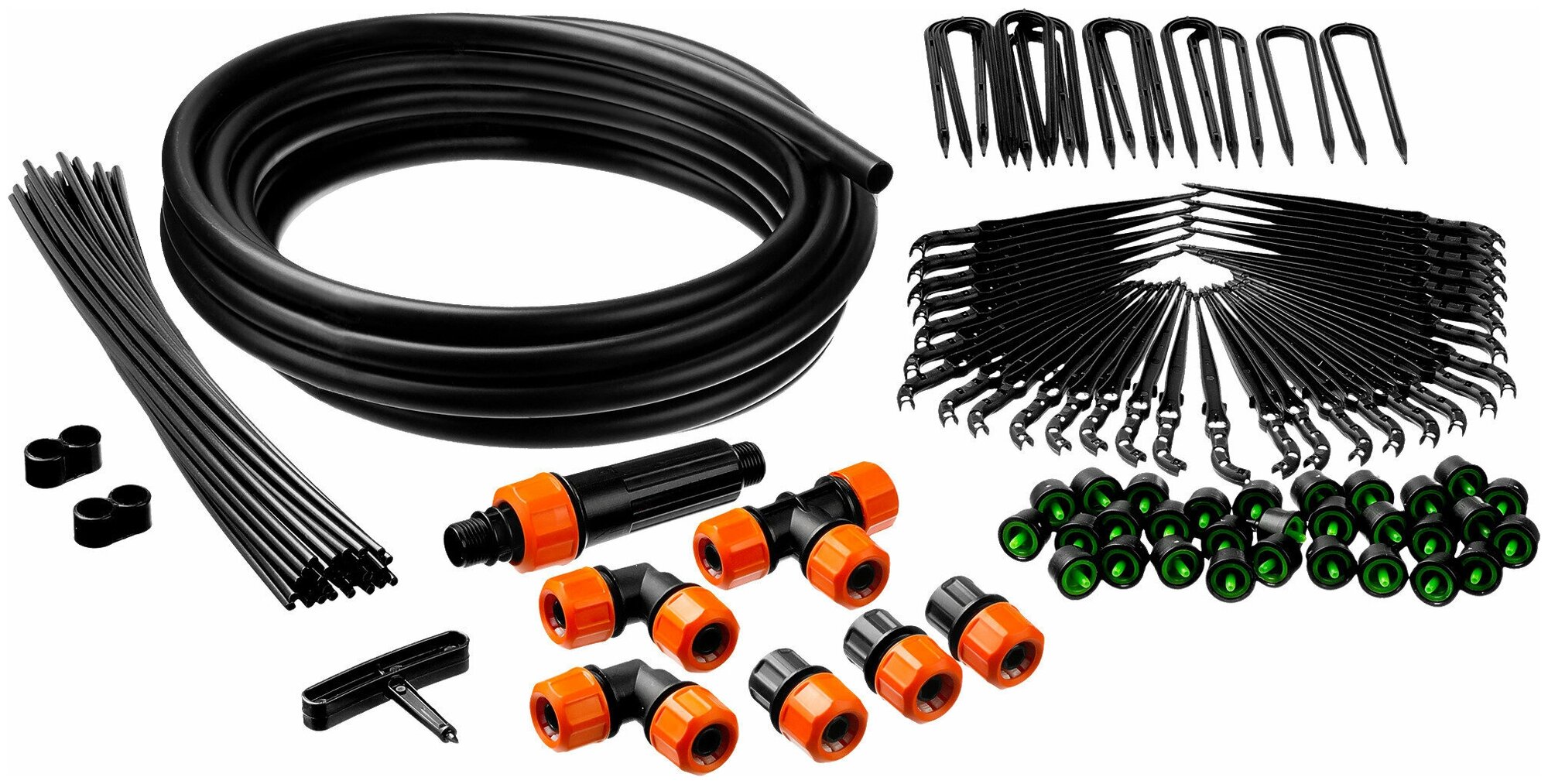 Main hose 1/2" 9 m - 1 piece, microtube - 30 pcs, collet tee 1/2" - 1 piece, collet clamp 1/2" - 3 pcs, collet corner 1/2" - 2 pcs, compensated dropper - 31 pcs, arrow with clip - 30 pcs, fine filter - 1 piece, clip d