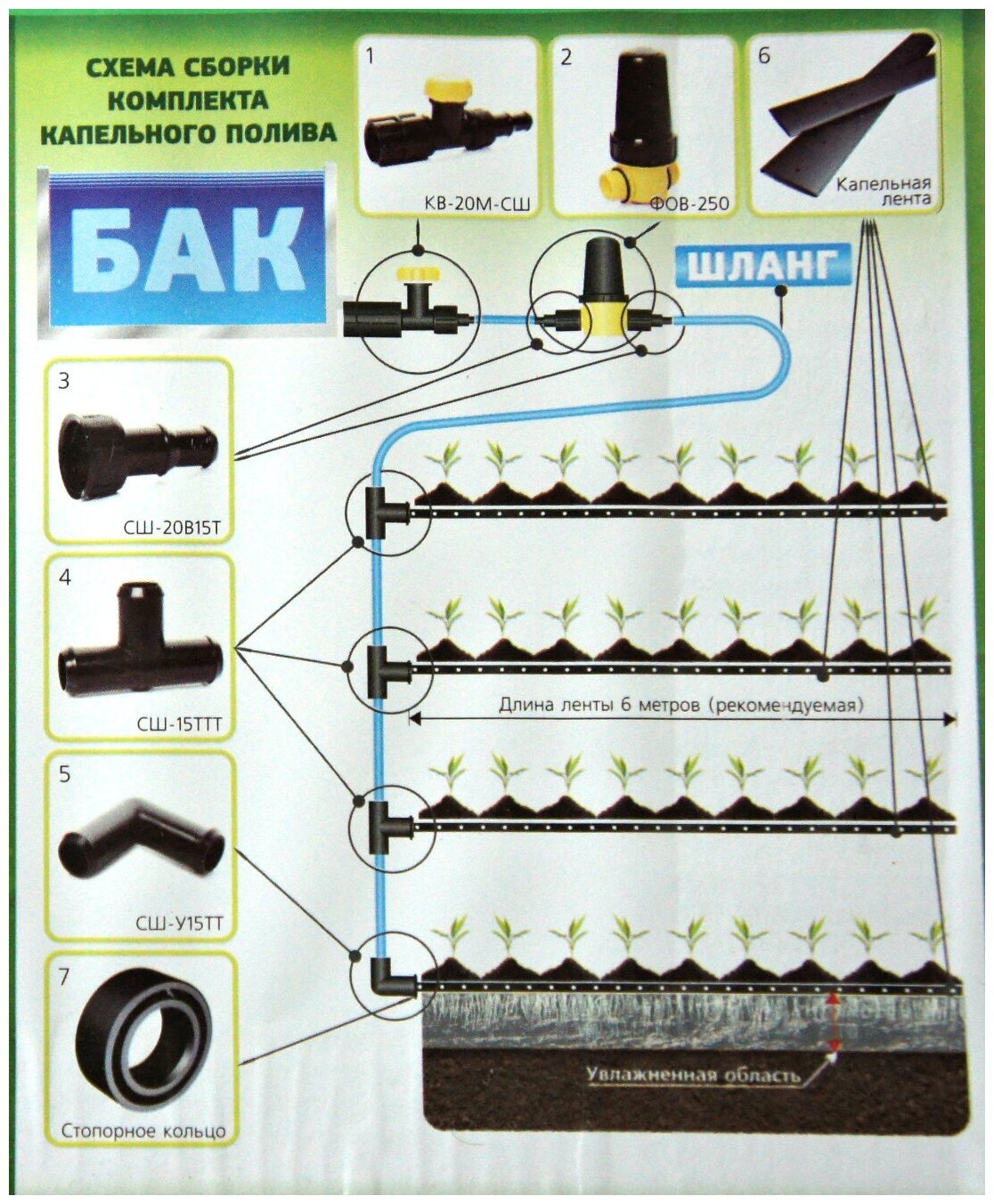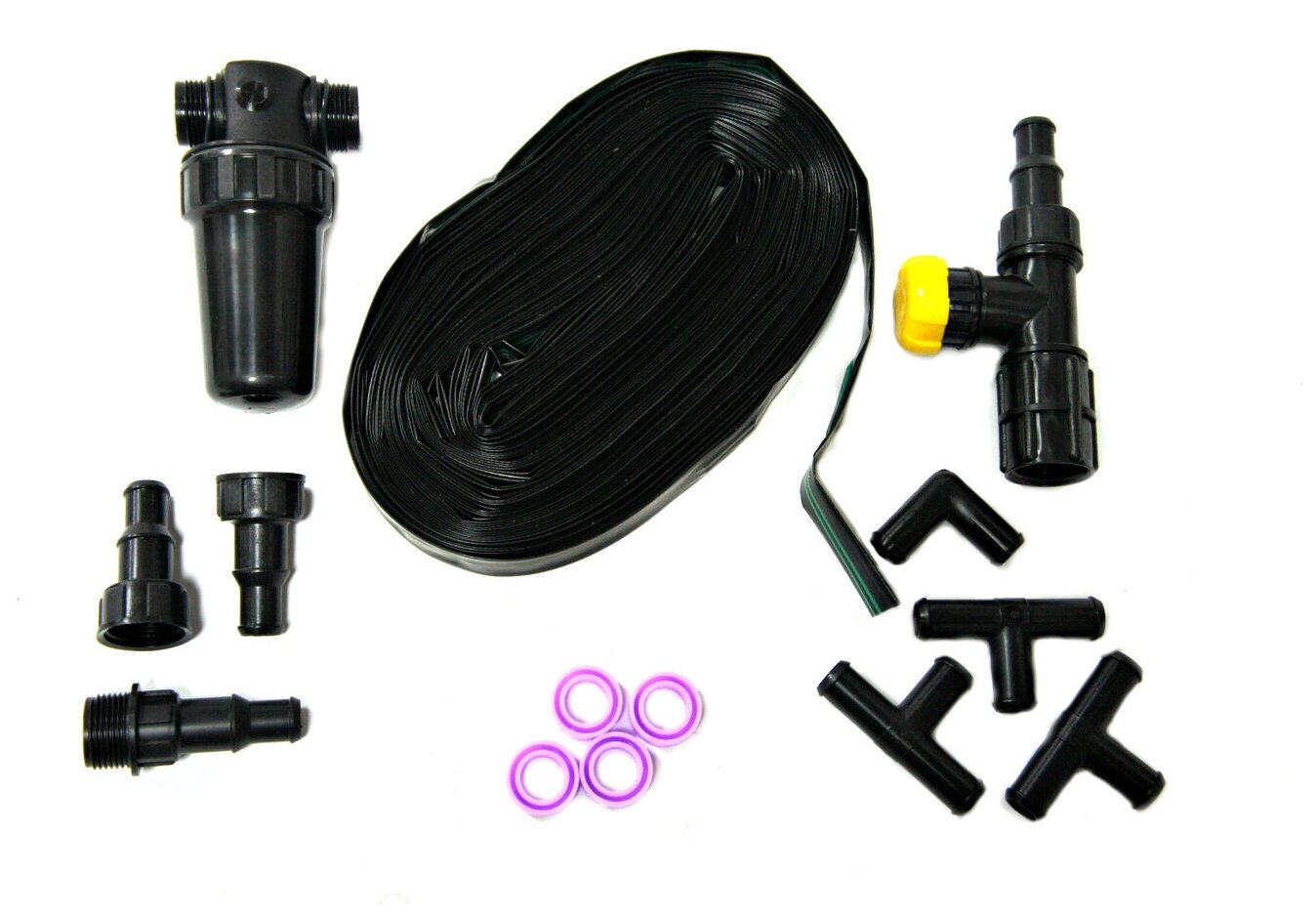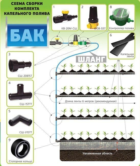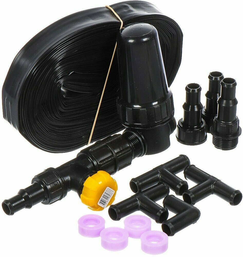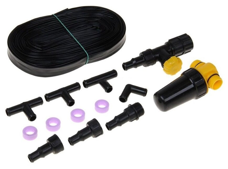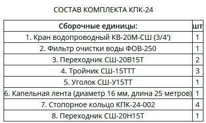 Water tap kv-20m-ssh 3/4" - 1 pc, water purification filter fov-250 - 1 pc, adapter ssh-20v15t - 2 pcs, tee ssh-15ttt - 3 pcs, corner ssh-u15tt - 1 pc, drip tape 16 mm - 25 m, adapter ssh-20n15t - 1 pc, retaining ring kpk-24-002 - 4 pcs