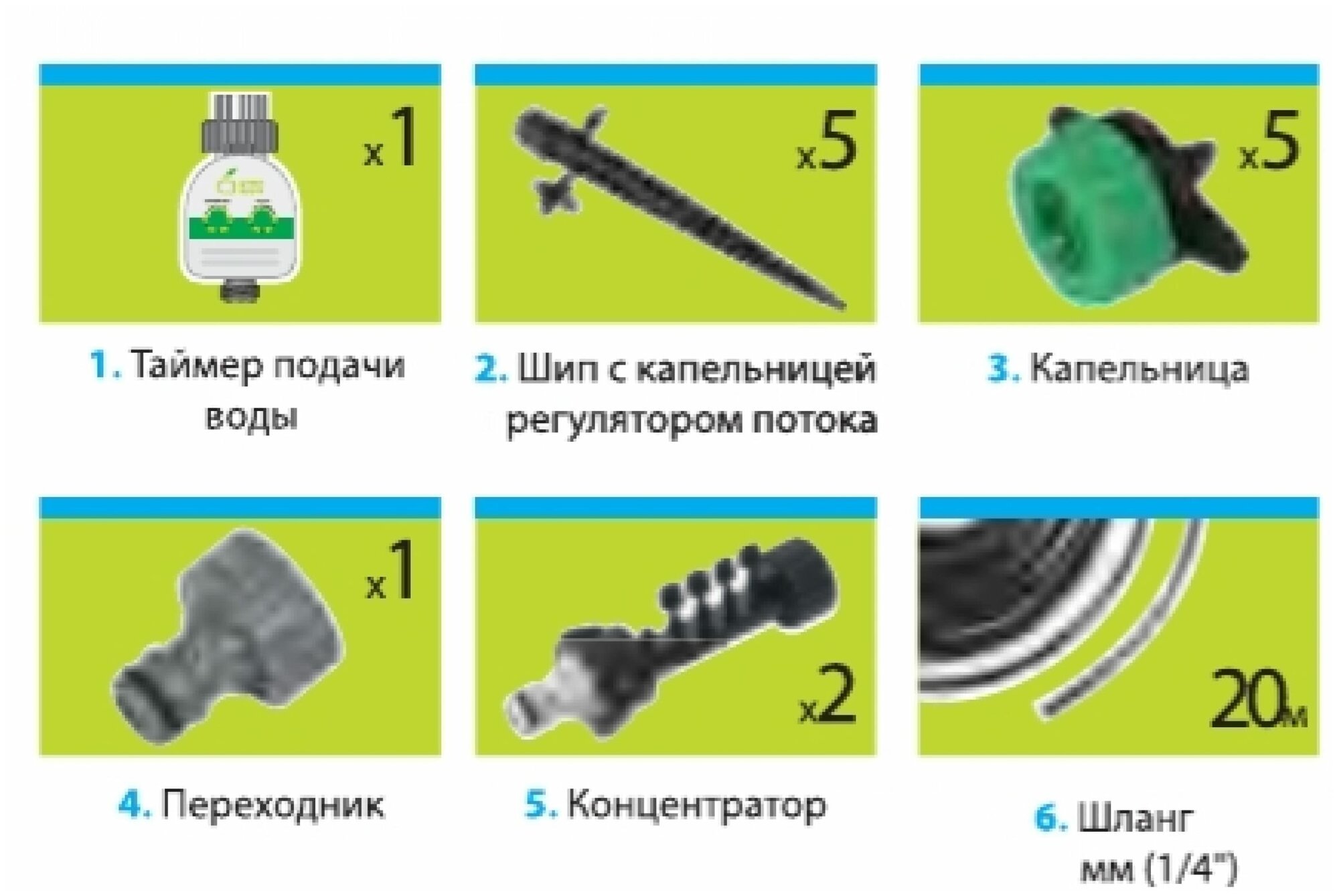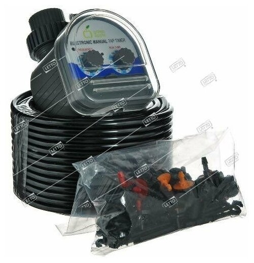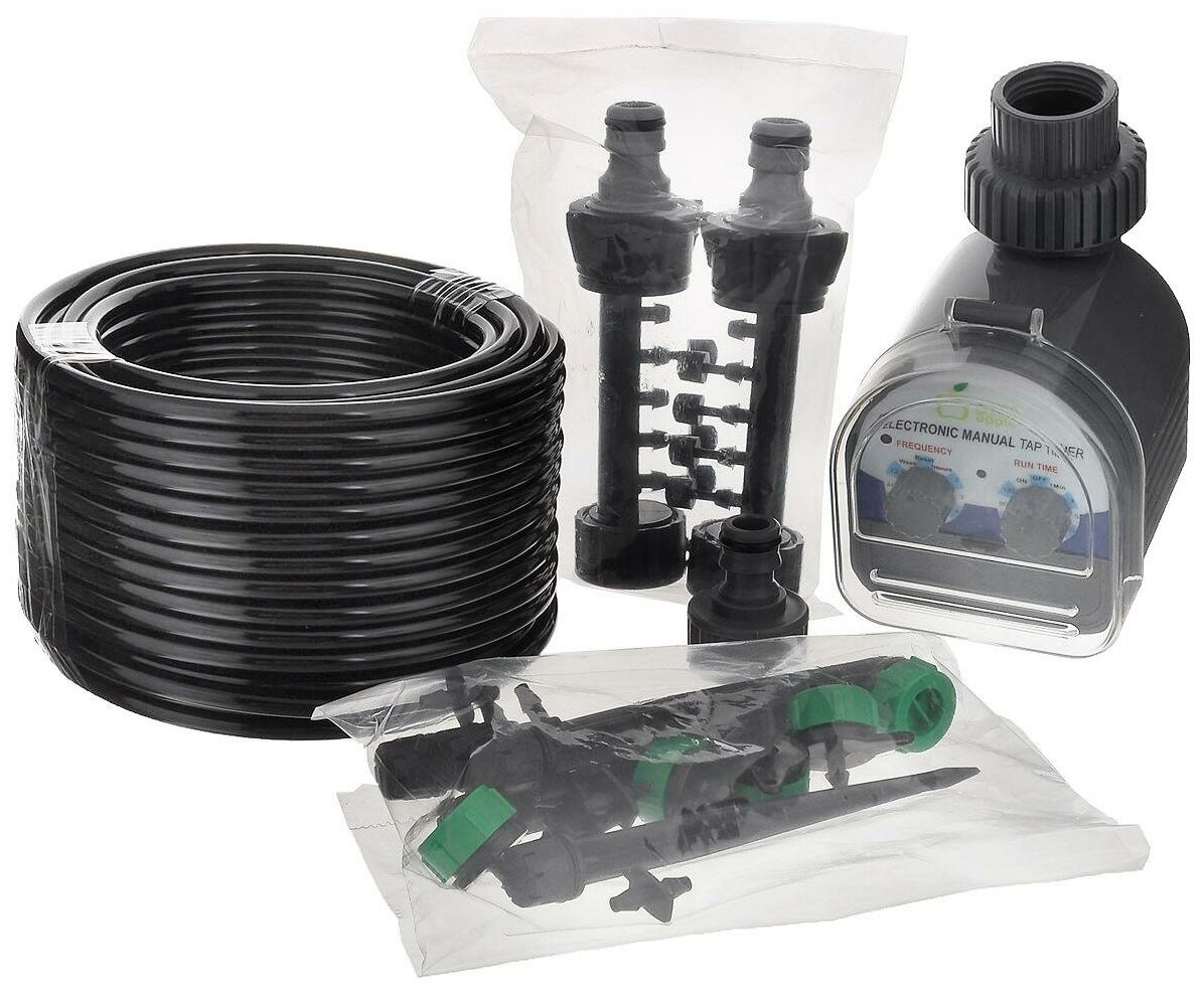 Water supply timer, spike with dropper and current regulator - 5 pcs, dropper - 5 pcs, adapter, concentrator - 2 pcs, hose 1/4 "6.35 mm - 20 m