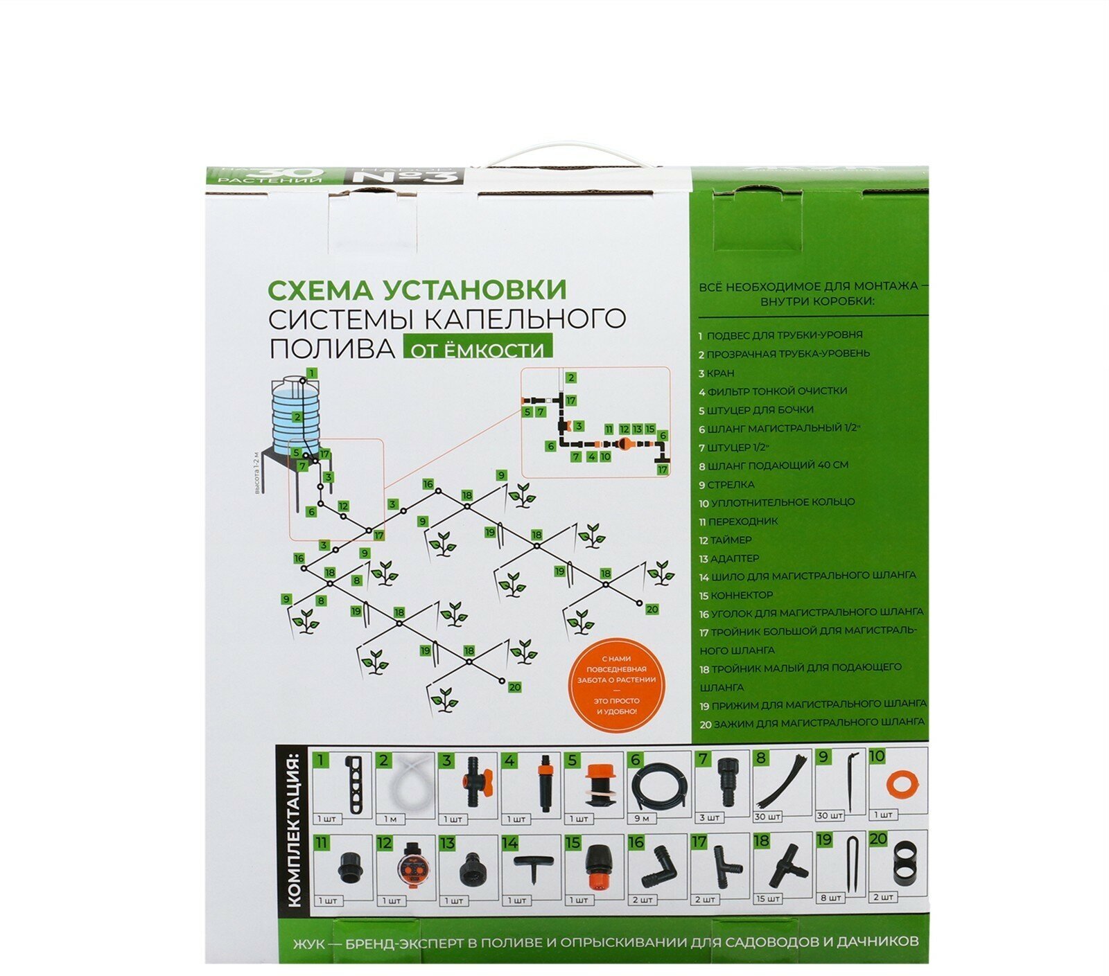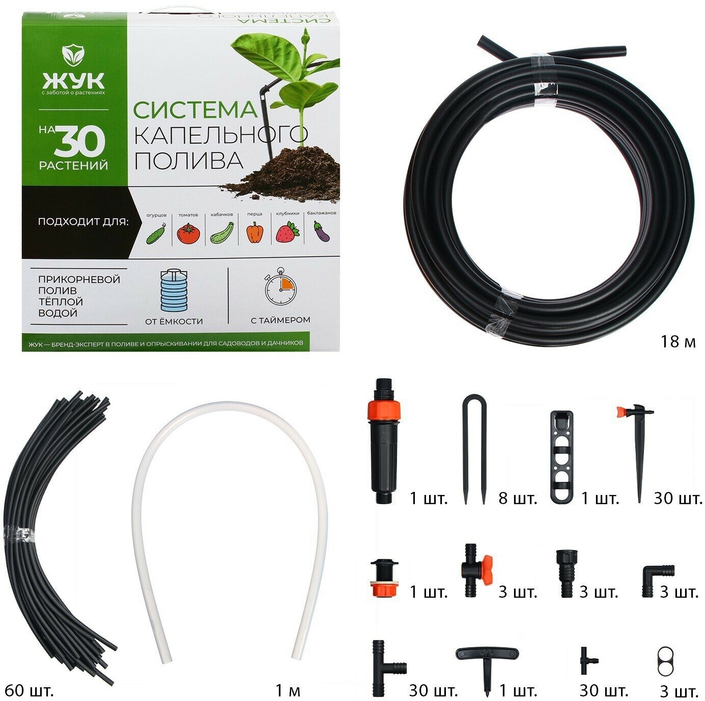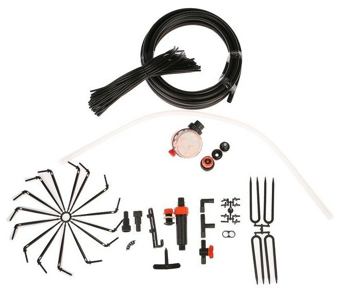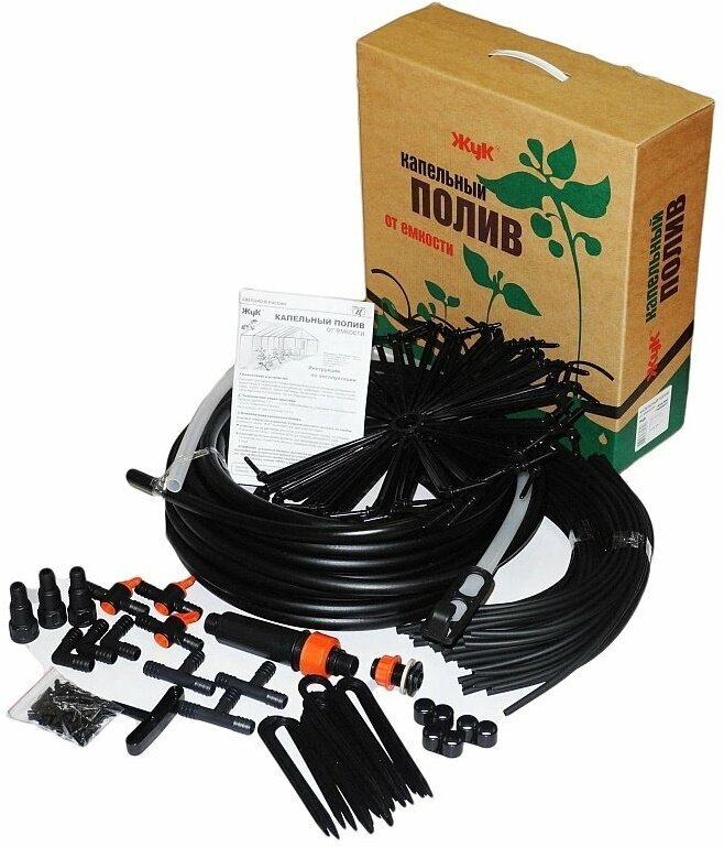 Electronic timer - 1 pc., main hose 9 m - 1 pc., supply hose 40 cm - 30 pcs., droppers - 30 pcs., connection to the tank - 1 pc., transparent level tube 1 m - 1 pc., hanger for level tube - 1 pc., small tee -