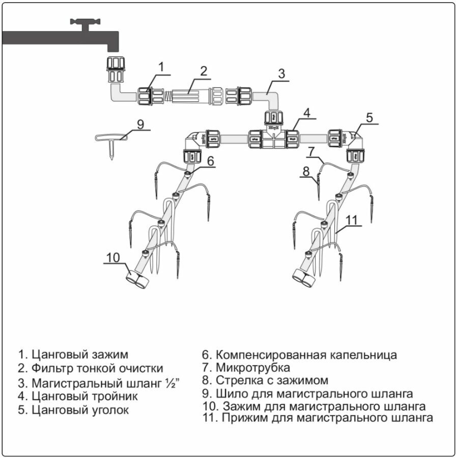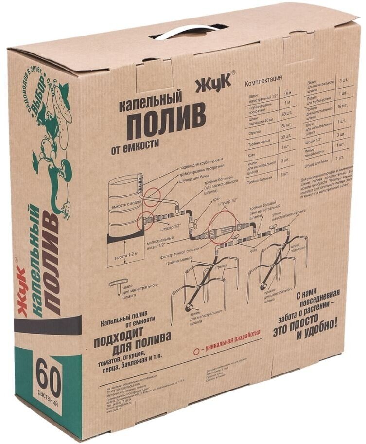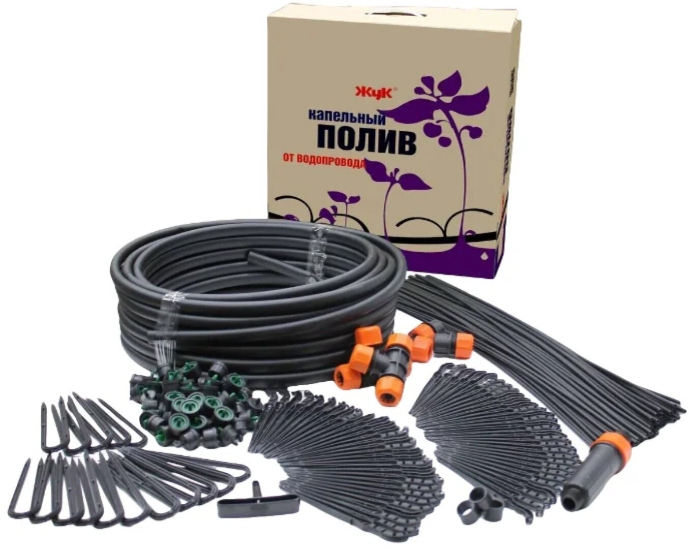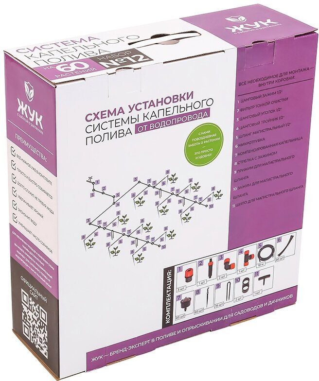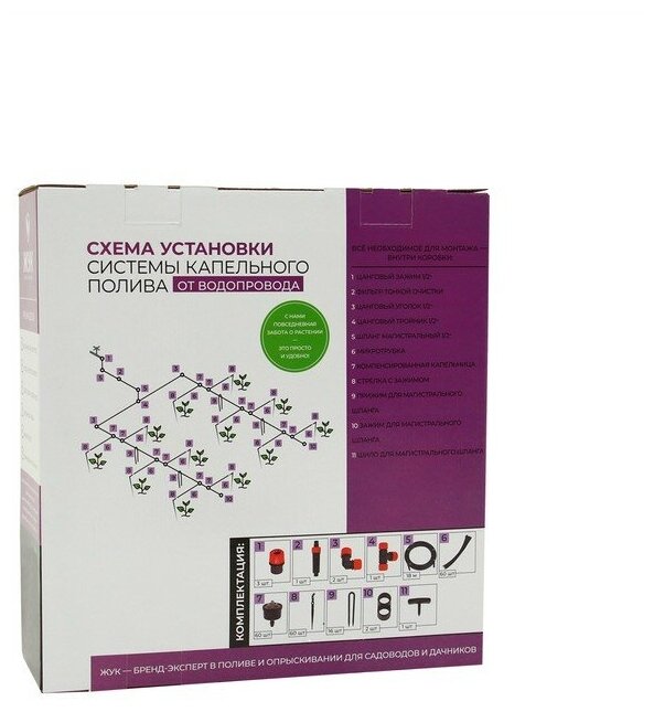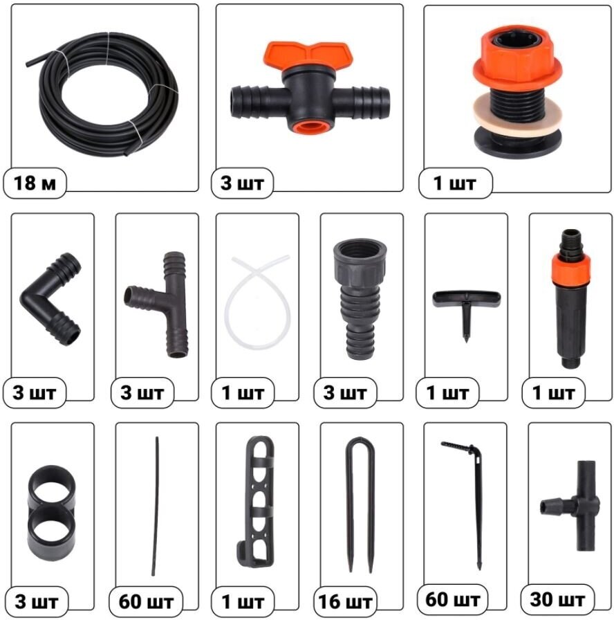 Main hose - 18 m - 1 pc., microtube - 60 pcs., collet tee 1/2-1 pc., collet clamp 1/2-3 pcs., collet angle 1/2-2 pcs., compensated dropper - 61 pcs. ., arrow with clip - 60 pcs., fine filter - 1 pc., clip for ma
