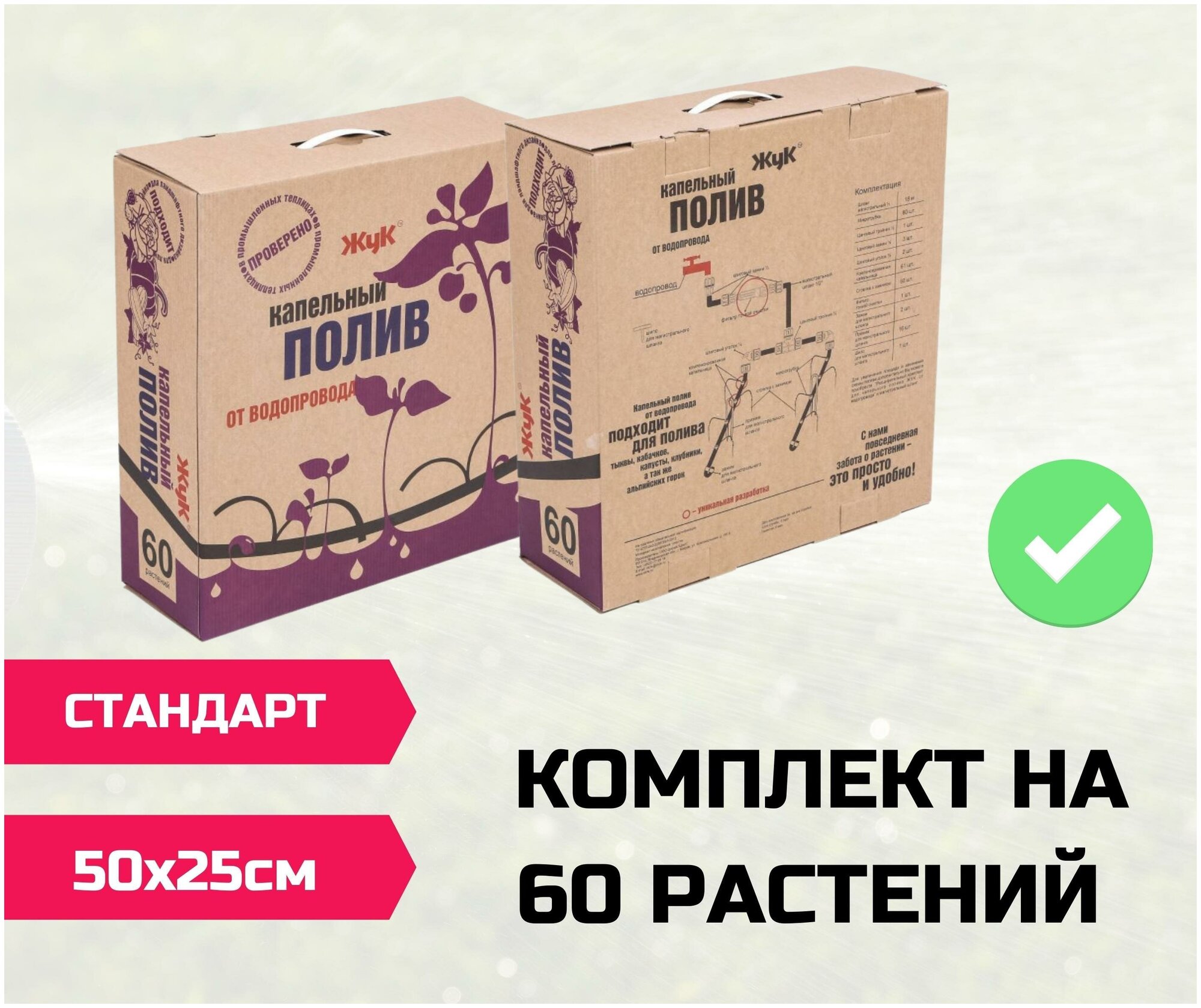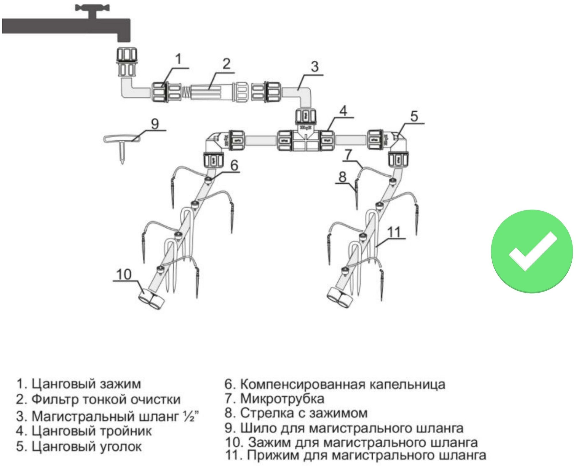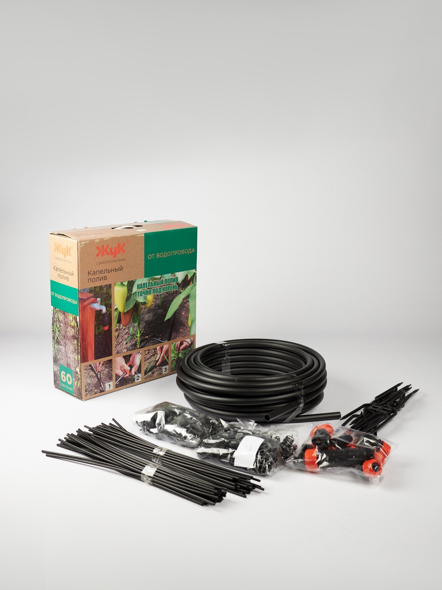 Main hose - 18 m - 1 pc., microtube - 60 pcs., collet tee 1/2-1 pc., collet clamp 1/2-3 pcs., collet angle 1/2-2 pcs., compensated dropper - 61 pcs. ., arrow with clip - 60 pcs., fine filter - 1 pc., clip for ma