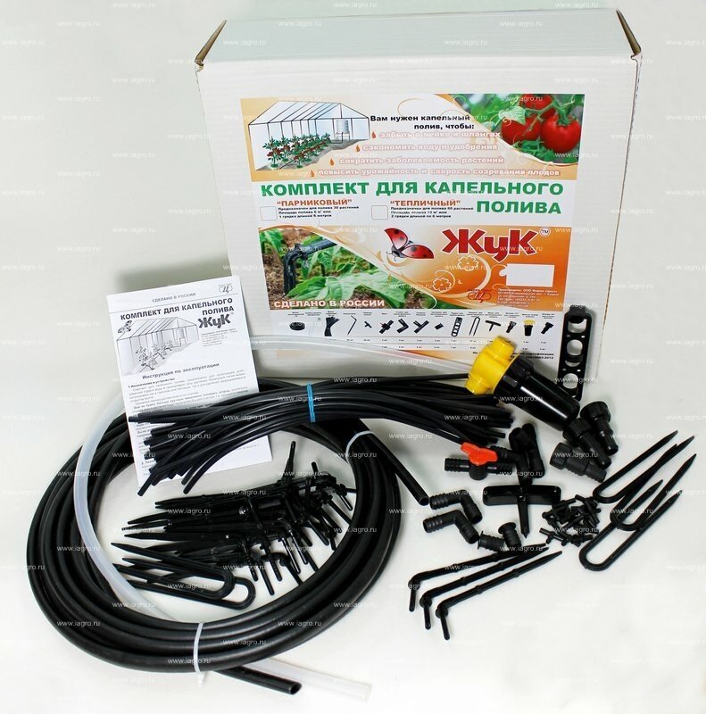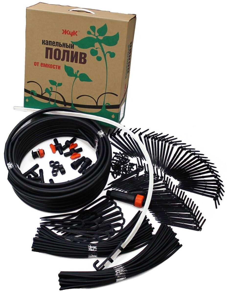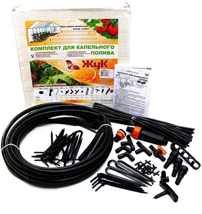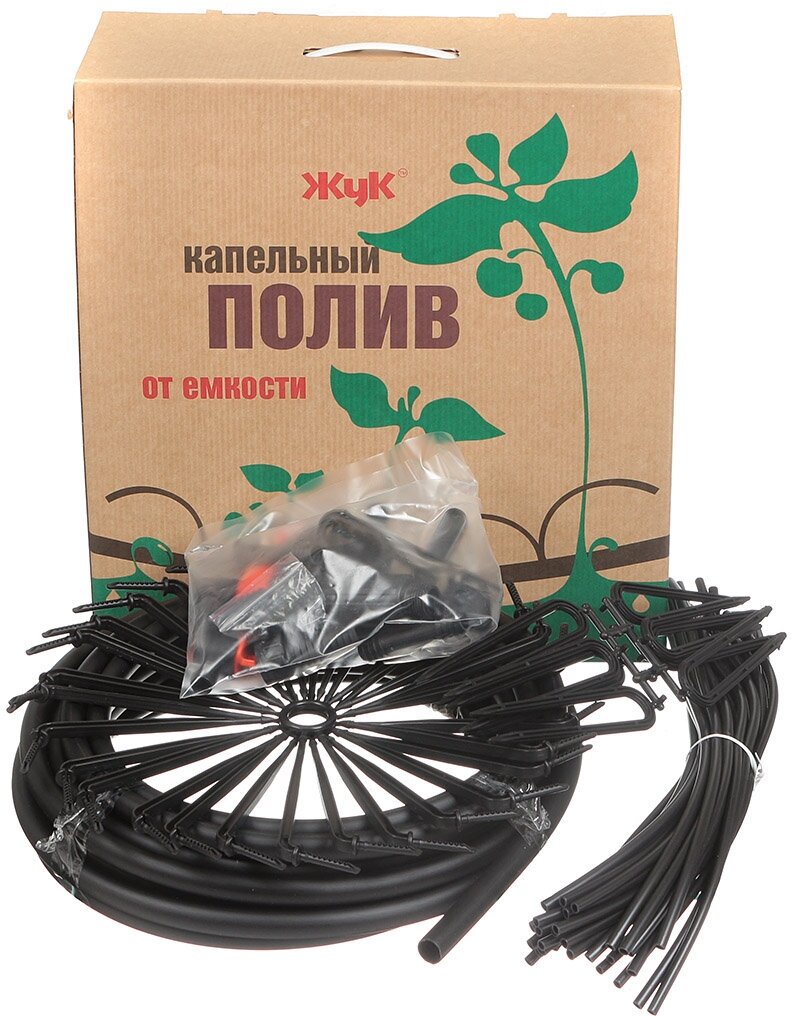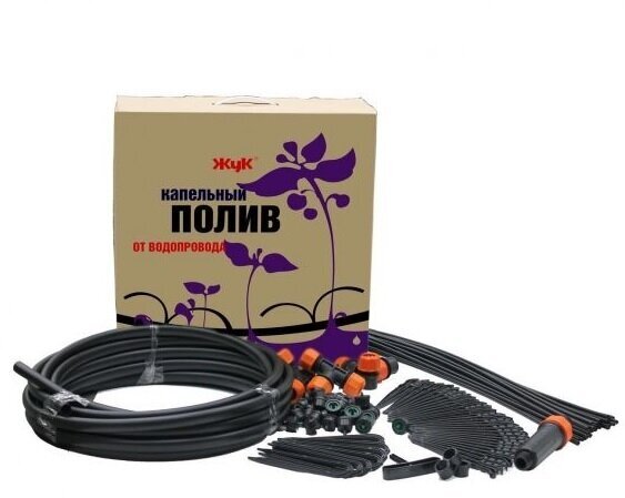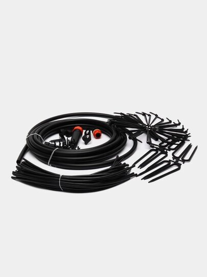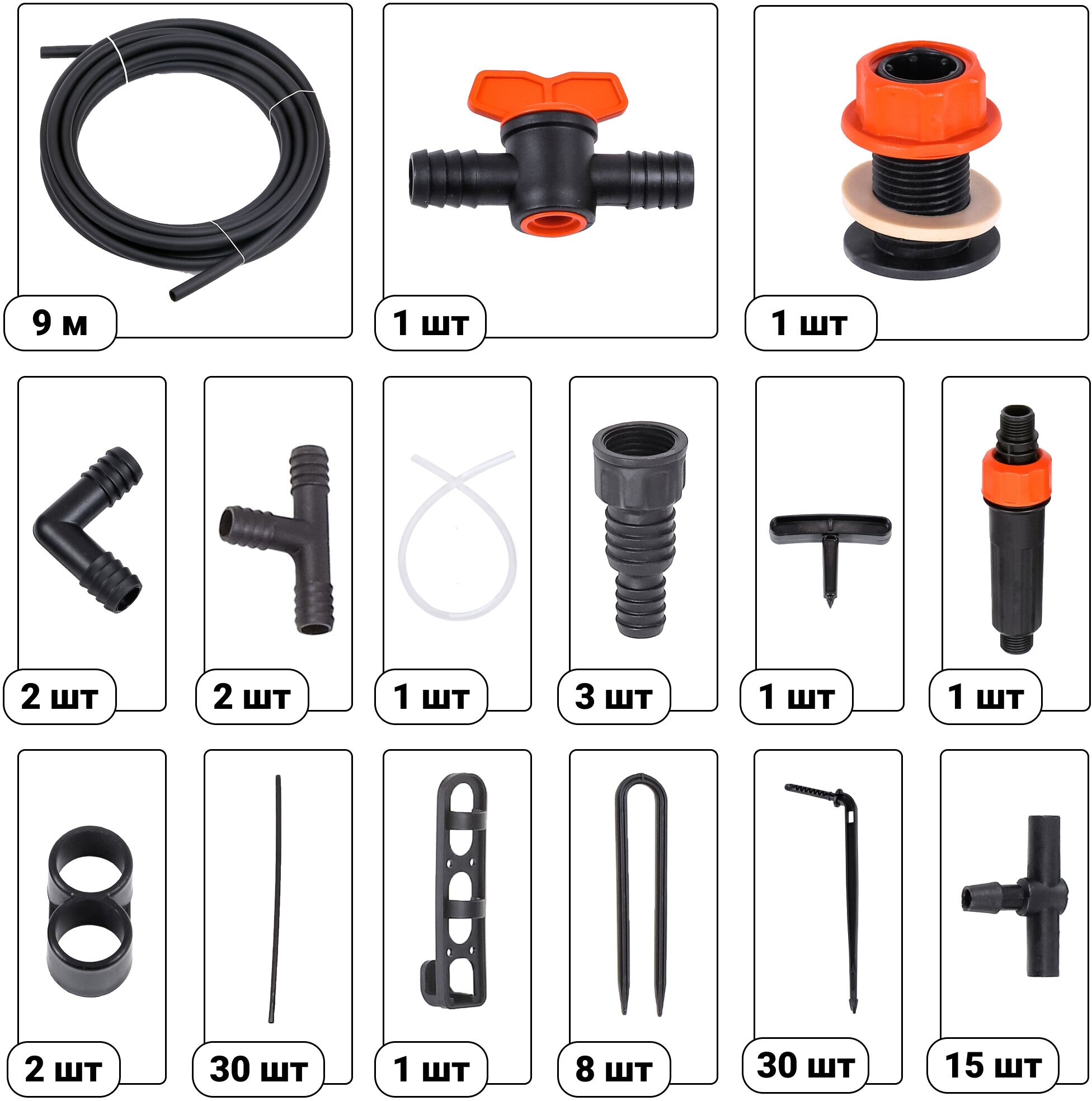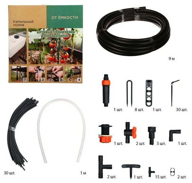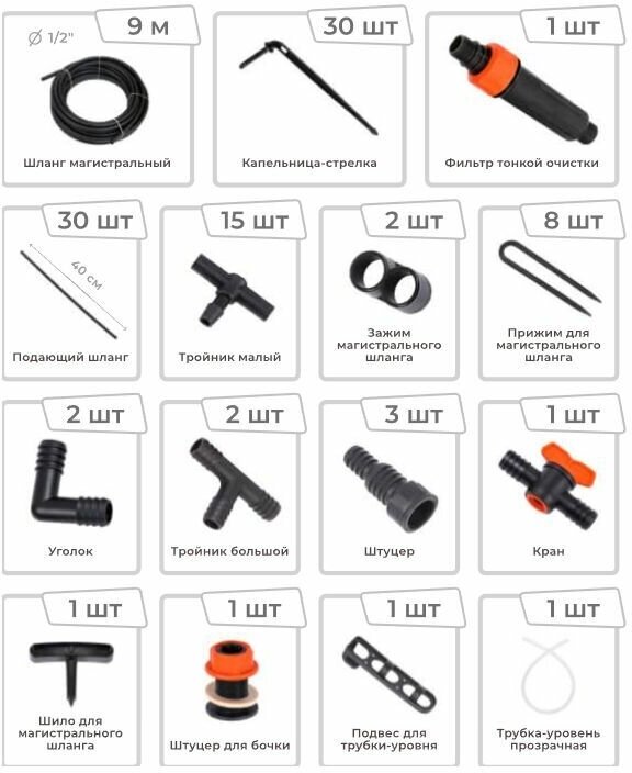 Connection to the tank - 1 pc., main hose 9 m - 1 pc., transparent level tube 1 m - 1 pc., suspension for the level tube - 1 pc., supply hose 40 cm - 30 pcs., droppers - 30 pcs. ., small tee - 15 pcs., faucet - 1 pc., corner for