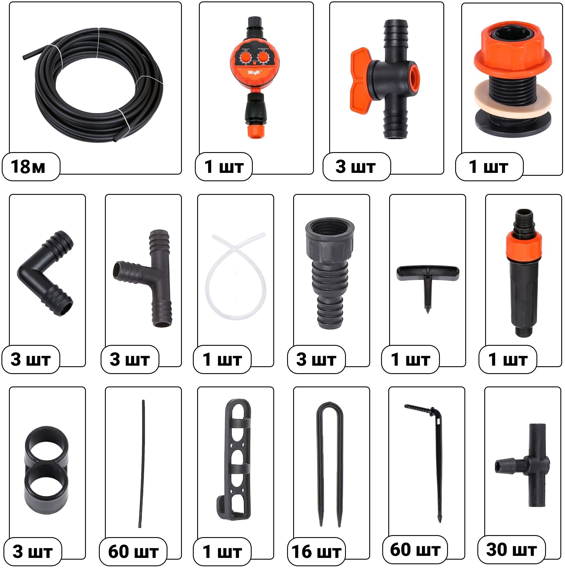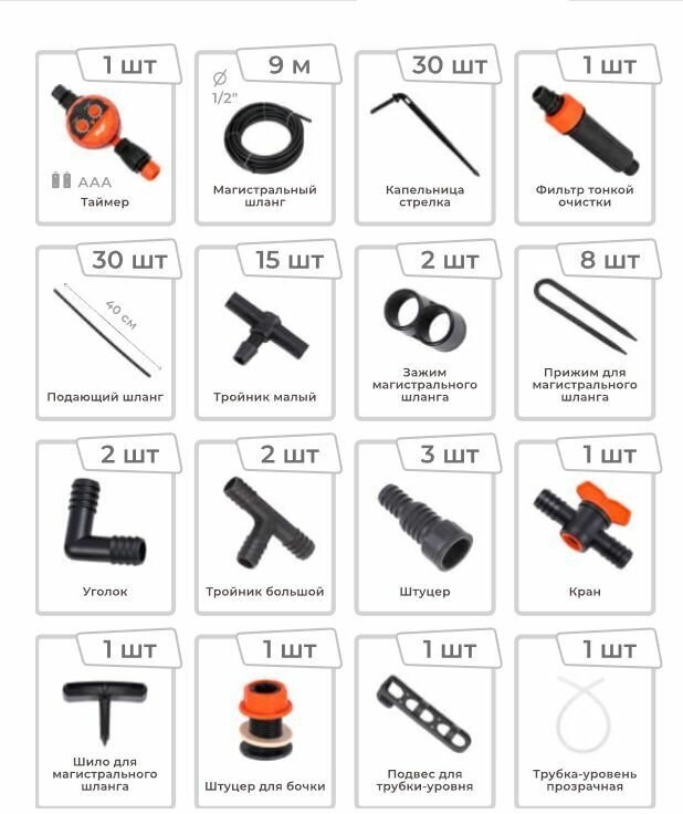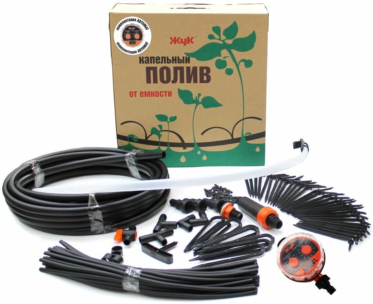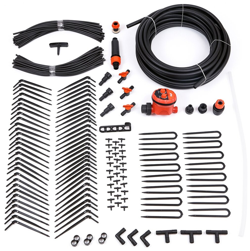 Master block - 1 pc,<br>main hose 15 m - 1 pc,<br>supply hose 10 m - 1 pc,<br>t-shaped connector 13 mm 1/2 1 pc,<br>t- shaped connector - 10 pcs,<br>pegs for hose 4.6 mm 3/16 - 15 pcs,<br>pegs for hose 13 mm 1/2 - 10 pcs,<br>re