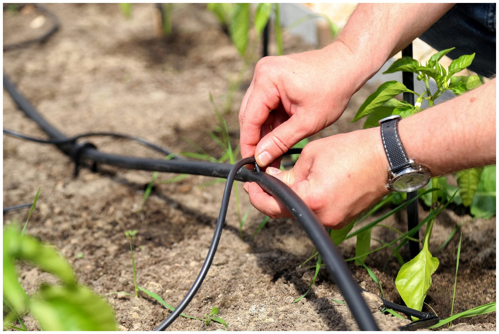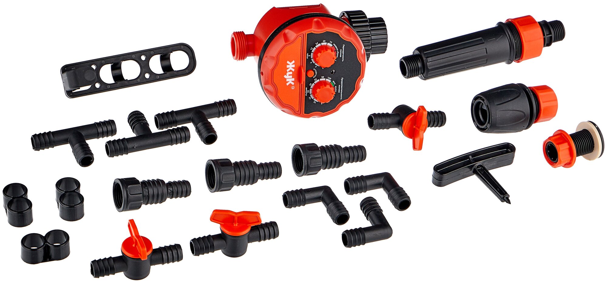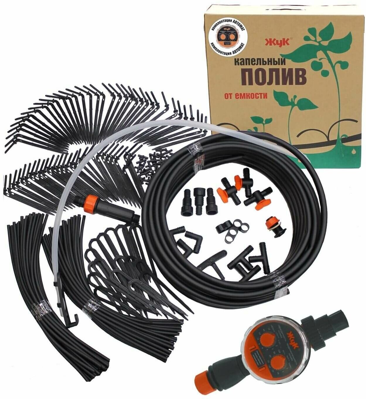Master block - 1 pc,<br>main hose 15 m - 1 pc,<br>supply hose 10 m - 1 pc,<br>t-shaped connector 13 mm 1/2 1 pc,<br>t- shaped connector - 10 pcs,<br>pegs for hose 4.6 mm 3/16 - 15 pcs,<br>pegs for hose 13 mm 1/2 - 10 pcs,<br>re