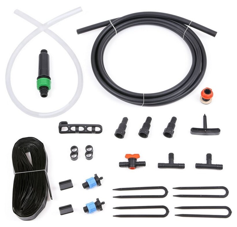 Master block - 1 pc,<br>main hose 15 m - 1 pc,<br>supply hose 10 m - 1 pc,<br>t-shaped connector 13 mm 1/2 1 pc,<br>t- shaped connector - 10 pcs,<br>pegs for hose 4.6 mm 3/16 - 15 pcs,<br>pegs for hose 13 mm 1/2 - 10 pcs,<br>re