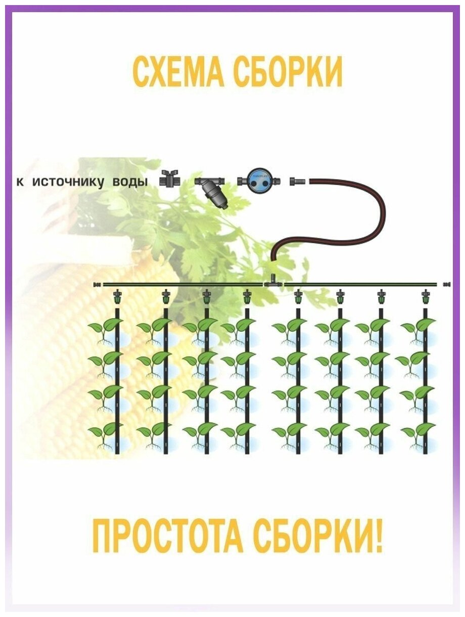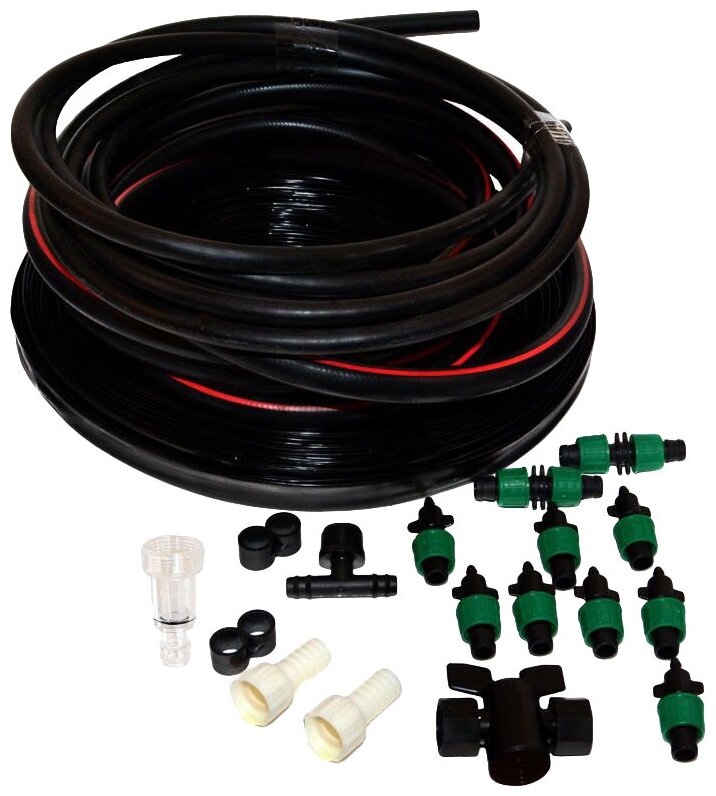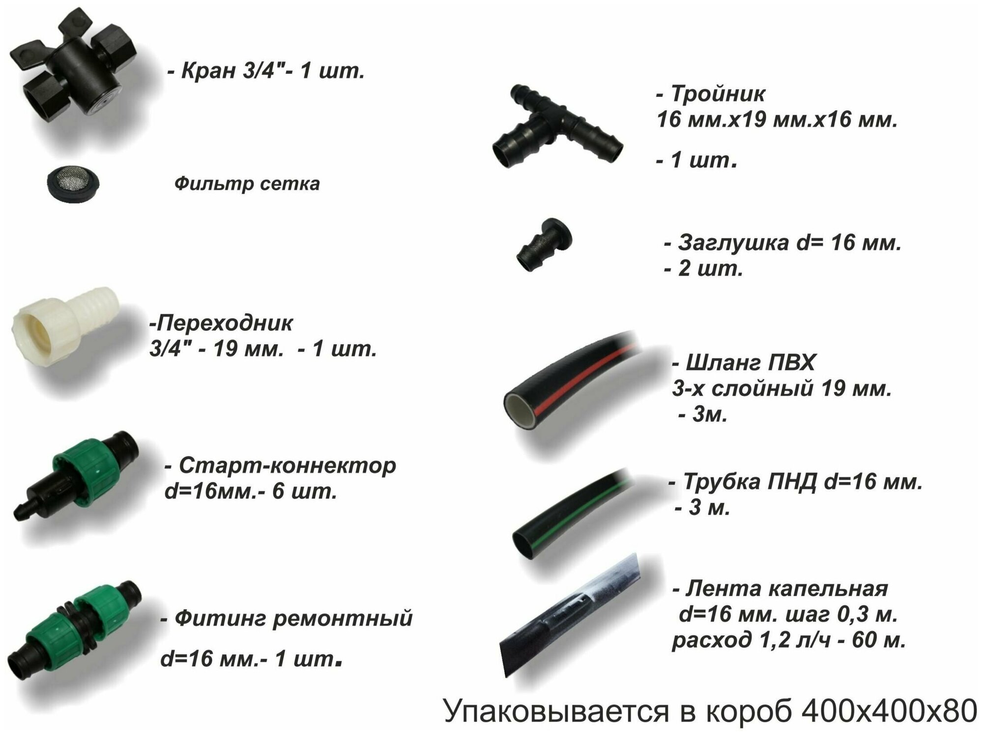 Tap 3/4" - 1 pc, adapter 3/4" - 1 pc, repair fitting 16 mm - 1 pc, plug - 2 pcs, HDPE tube - 3 m, mesh filter - 1 pc, start connector - 6 pcs, tee - 1 piece, three-layer pvc hose - 3 m, drip tape - 60 m