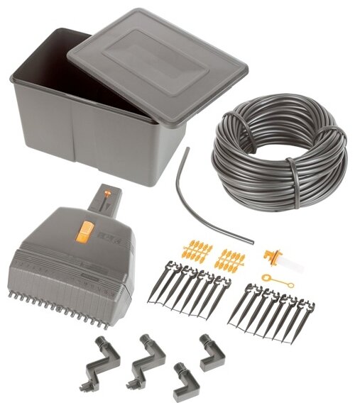 Water container with lid 18 l - 1 pc, drip holder - 16 pcs, line plug - 20 pcs, capillary hose - 30 m, automatic dispenser dispenser - 1 pc, mounting feet - 4 pcs