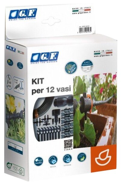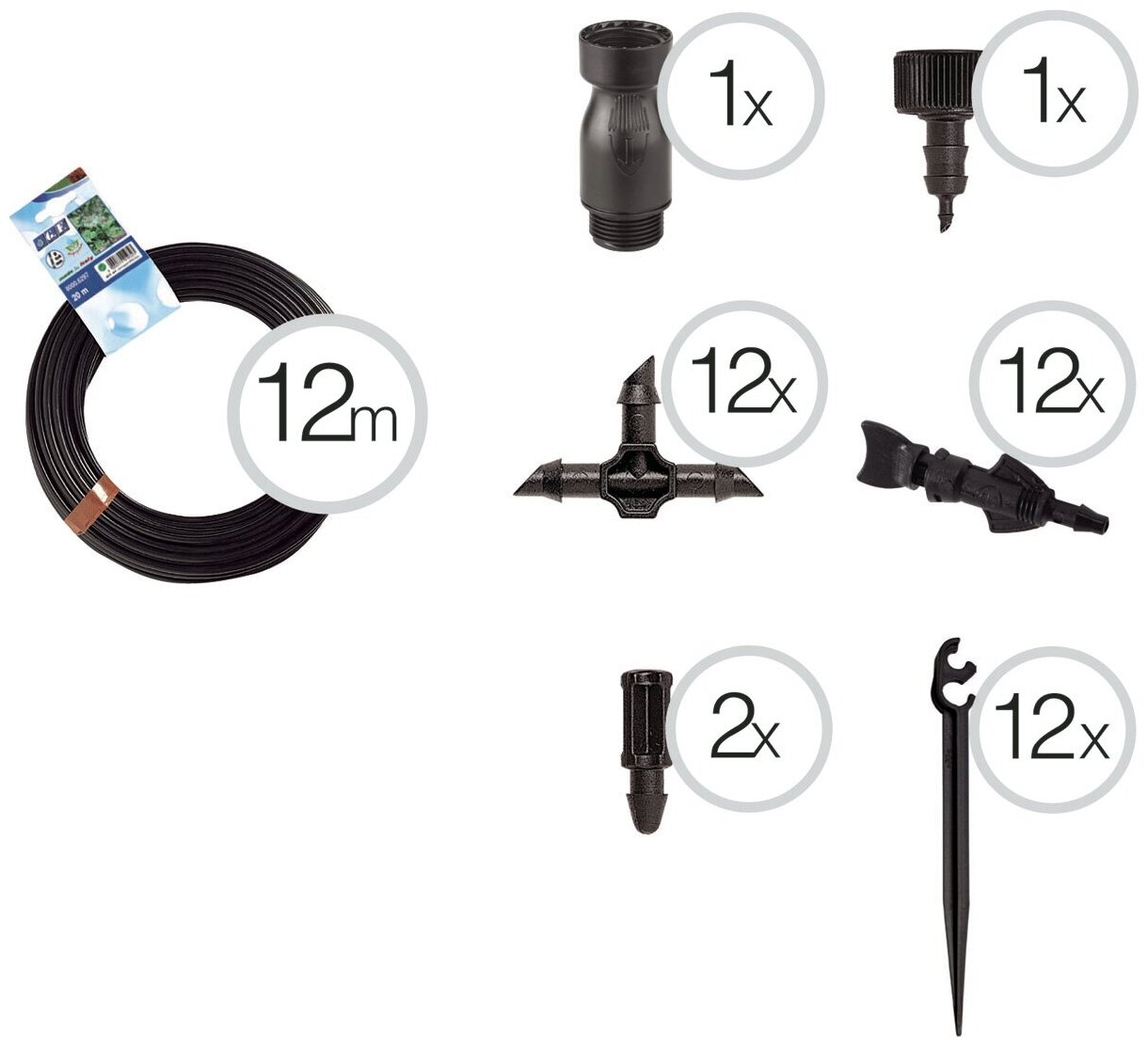 Pressure regulator - 1 pc, tap connector with 3/4'' thread - 1 pc, capillary hose - 12 m, t-piece - 12 pcs, elbow connector - 4 pcs, hose supports - 12 pcs, adjustable drippers in lines - 12 pcs, plugs - 2