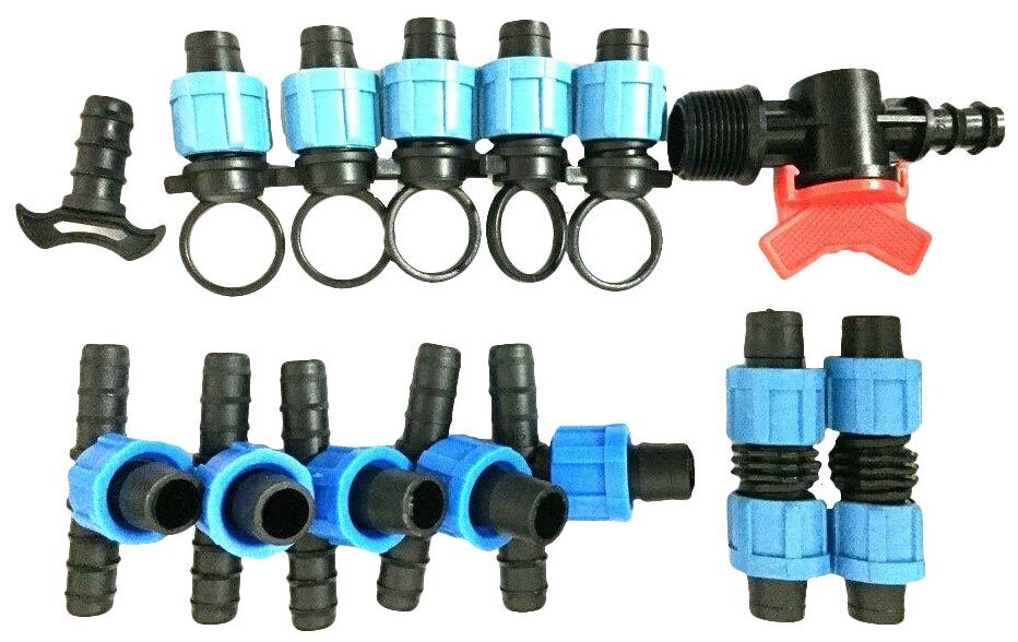 Drip tape with UV protection - 50 m, faucet - 1 pc, T-adapter - 5 pcs, tape plug - 5 pcs, hose plug - 1 pc, repair fitting - 2 pcs