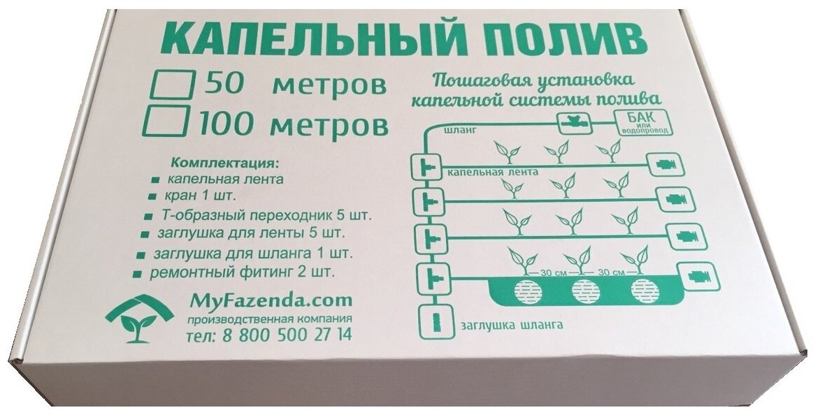 Drip tape with UV protection - 100 m, faucet - 1 pc, T-adapter - 5 pcs, tape plug - 5 pcs, hose plug - 1 pc, repair fitting - 2 pcs