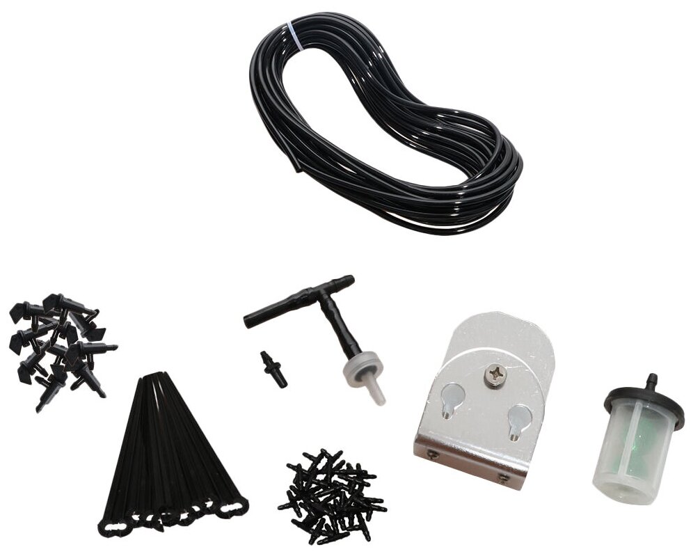 Timer with built-in pump - 1 pc, filter - 1 pc, universal fasteners - 1 pc, microtube 5/7 mm - 10 m, tee 1/4 "- 10 pcs, adjustable taps - 10 pcs, bracket - 10 pcs, anti-siphon - 1 pc; plug - 1 pc