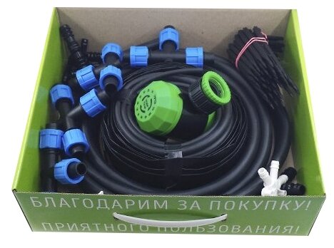 Master block - 1 pc,<br>main hose 15 m - 1 pc,<br>supply hose 10 m - 1 pc,<br>t-shaped connector 13 mm 1/2 1 pc,<br>t- shaped connector - 10 pcs,<br>pegs for hose 4.6 mm 3/16 - 15 pcs,<br>pegs for hose 13 mm 1/2 - 10 pcs,<br>re