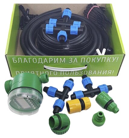 Drip tape - 50 m, automatic timer - 1 pc, corner fittings - 2 pcs, tees - 4 pcs, repair fittings - 2 pcs