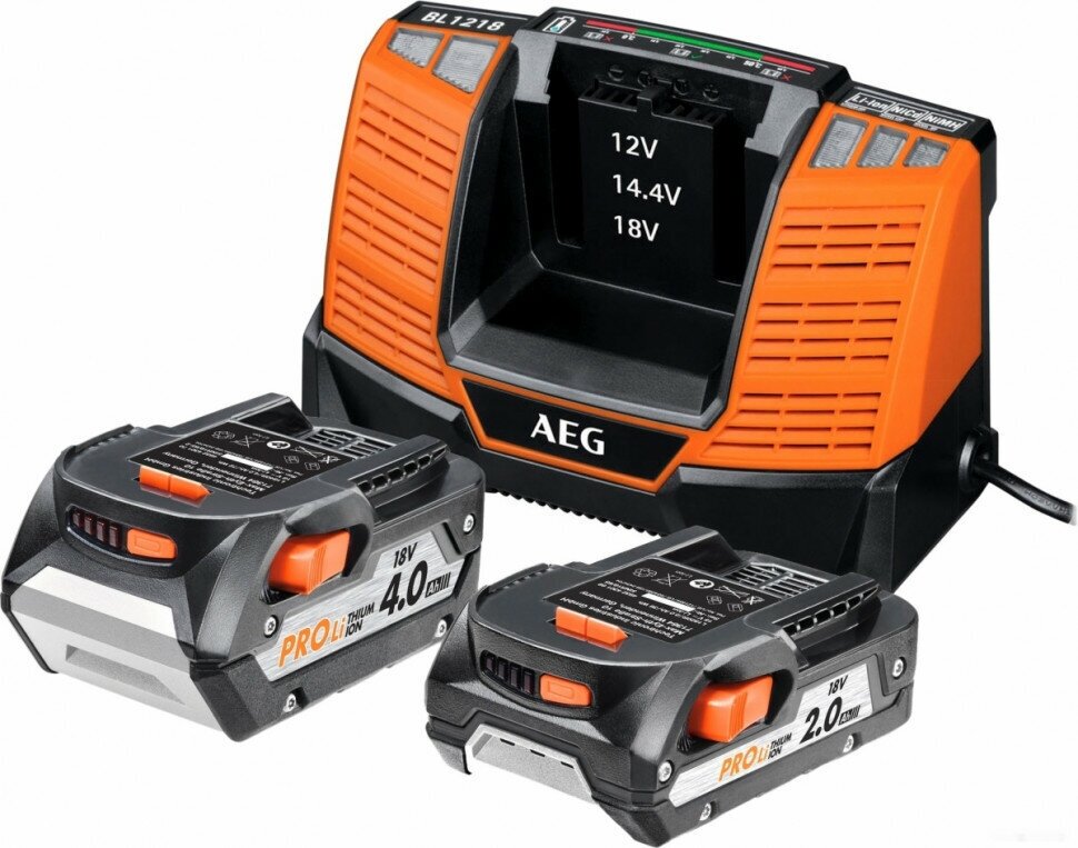 2 batteries included, compatible brand: AEG, type: kit, battery type: Li-Ion, battery design: slider, voltage: 18 V, capacity: 4 Ah