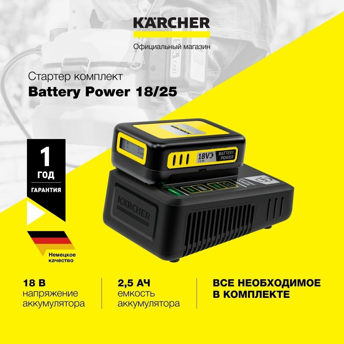 Compatible brand: KARCHER, type: kit, battery type: Li-Ion, battery design: slider, voltage: 18 V, capacity: 2.50 Ah, maximum charge time: 1.40 h, compatibility: all KARCHER 18 V line