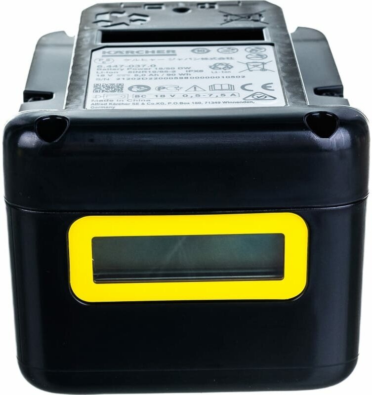Compatible brand: KARCHER, type: battery, battery type: Li-Ion, battery design: slider, voltage: 18 V, capacity: 5 Ah, maximum charge time: 2.60 h, compatibility: all KARCHER 18 V line