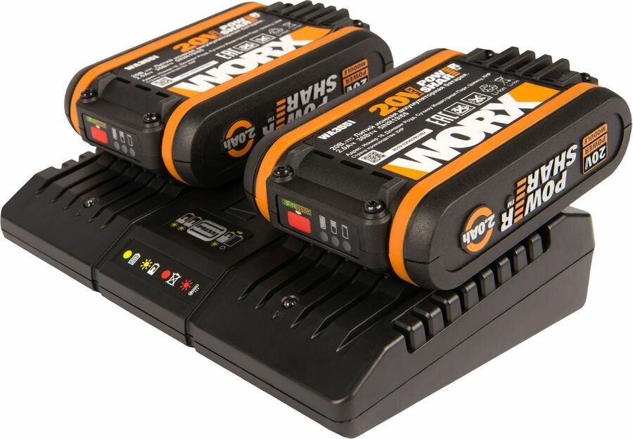 2 batteries included, compatible brand: WORX, type: kit, battery type: Li-Ion, battery design: slider, voltage: 20 V, capacity: 2 Ah, maximum charging time: 1 h