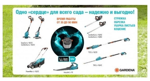 Compatible brand: GARDENA, type: battery, battery type: Li-Ion, battery design: slider, voltage: 18 V, capacity: 2.60 Ah, maximum charge time: 5 h, compatibility: with technology: 09823, 09825, 09335 , 08881, 08866, 05039, 09837, 0983