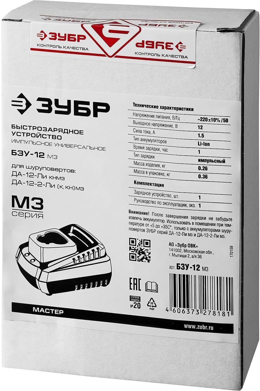 Compatible brand: ZUBR, type: charger, battery type: Li-Ion, battery design: clip, voltage: 12 V, compatibility: AKB-12-Li 15M3