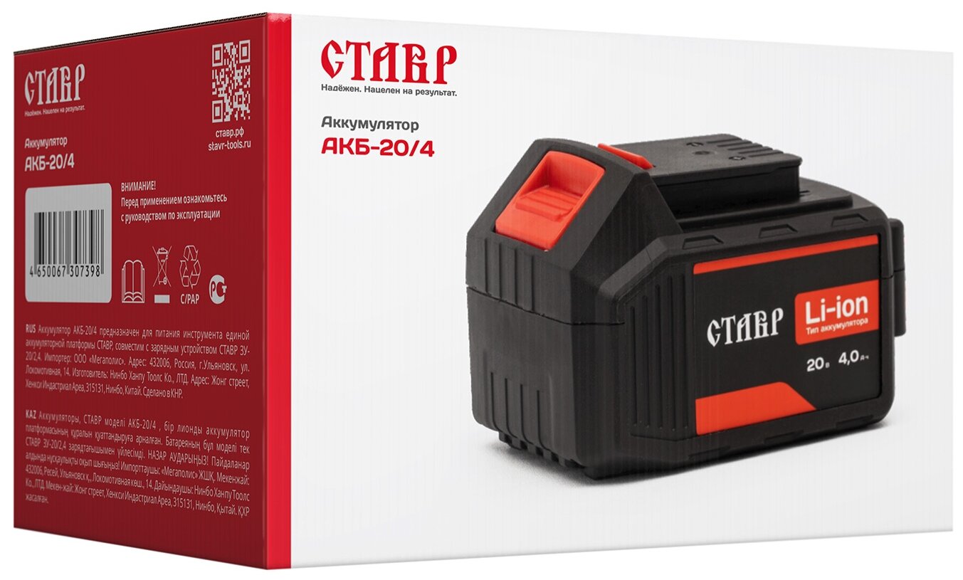 Compatible brand: Stavr, type: battery, battery type: Li-Ion, battery design: slider, voltage: 20 V, capacity: 4 Ah, maximum charge time: 2 h