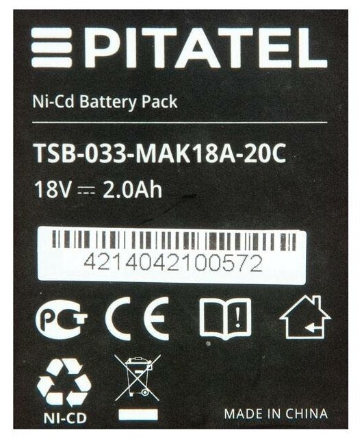 Compatible brand: Makita, type: battery, battery type: Ni-Cd, battery construction: clip, voltage: 18 V, capacity: 2 Ah, compatibility: 1820, 1822, 1823, 1833, 1834, 1835, 1835F, 192826 -5, 192827-3, 192828-1, 192829-9, 193061-8, 193102-0, 193140-2, 19315