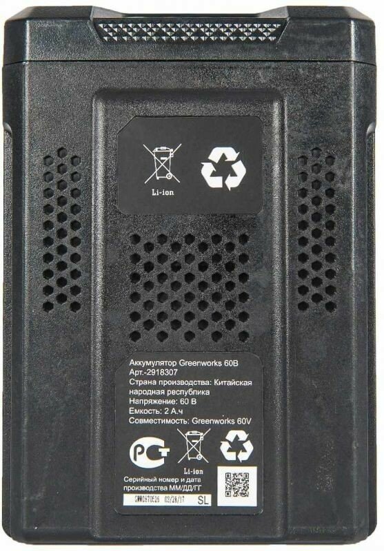 Compatible brand: GreenWorks, type: battery, battery type: Li-Ion, battery design: slider, voltage: 60 V, capacity: 2 Ah, maximum charge time: 1 h
