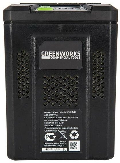 The battery is used in the line of all Greenworks 82V Commercial devices