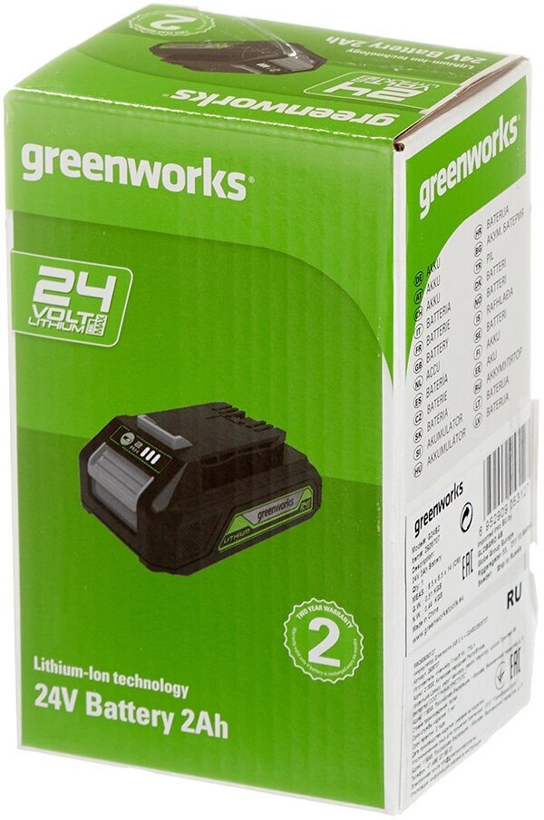 Compatible brand: GreenWorks, type: battery, battery type: Li-Ion, battery design: slider, voltage: 24 V, capacity: 2 Ah, maximum charge time: 0.75 h