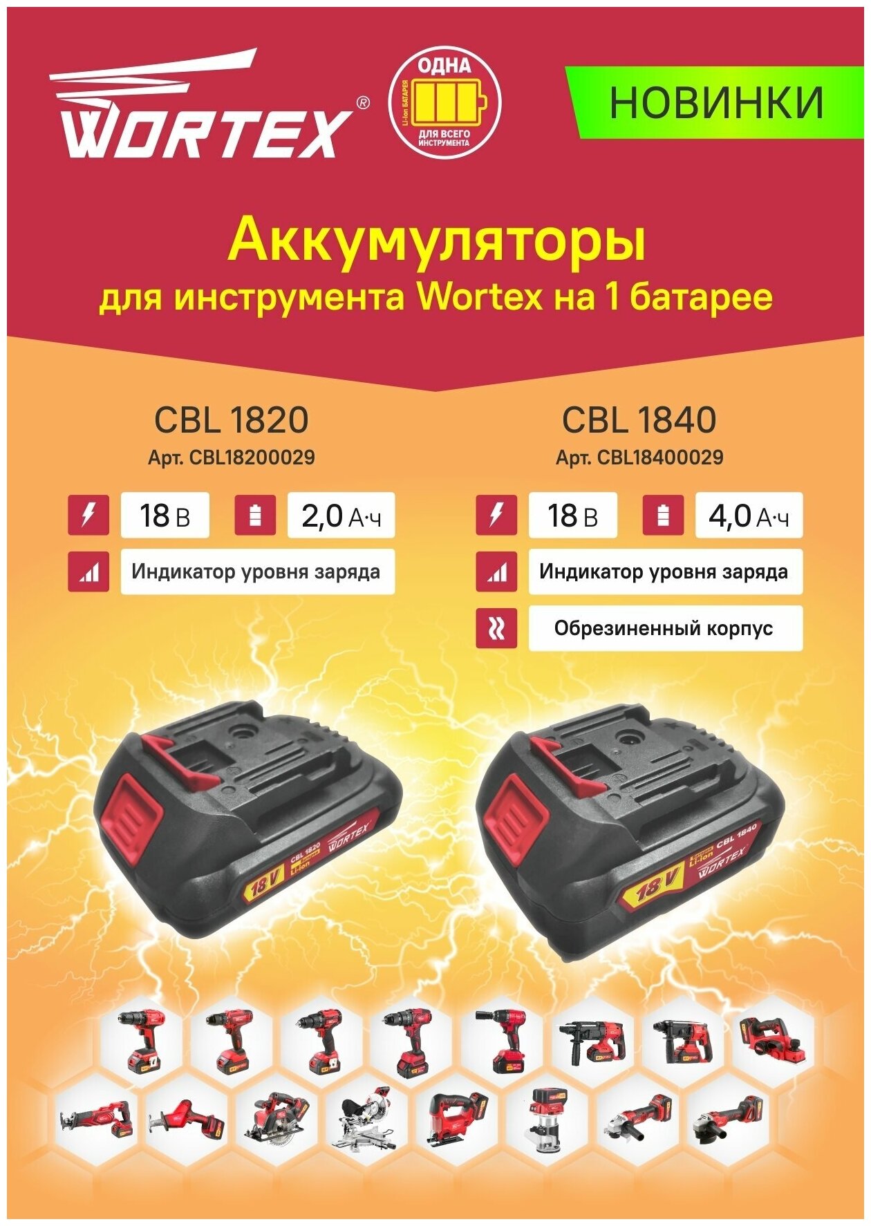 Battery WORTEX CBL 1820 18.0 V, 2.0 Ah, Li-Ion ALL1 18.0 V, 2.0 Ah, charge indicator CBL18200029