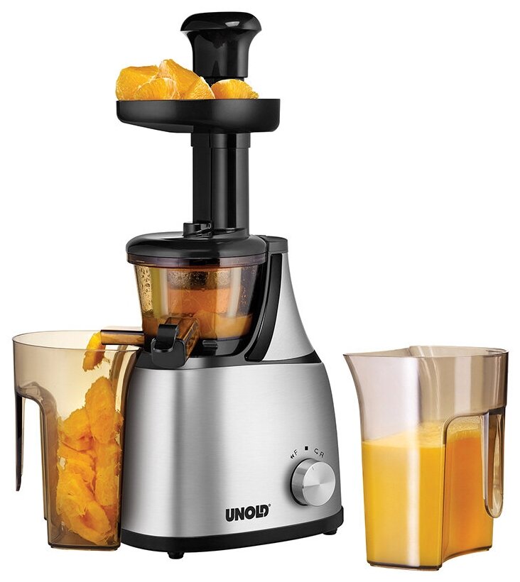 Type: auger, power: 160 W, type of auger juicer: vertical, juice tank volume: 1 l, pulp tank volume: 1 l, body material: stainless steel, features: automatic pulp ejection, system