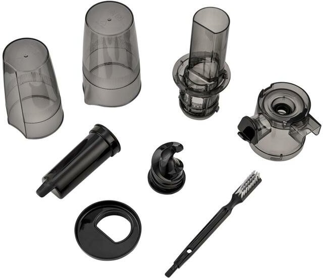 Coarse filter - 1 pc; fine filter - 2 pcs; number of screws: 1; juice tank: glass; mesh material: stainless steel steel; maximum rotation speed: 48 rpm; cleaning brush