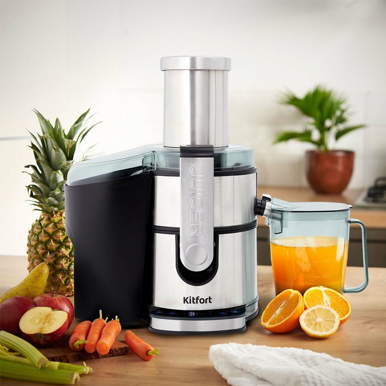 Type: centrifugal, power: 800 W, mouth width: 85 mm, juice tank volume: 1.10 l, pulp tank volume: 2 l, number of speeds: 5, body material: plastic, features: automatic pulp ejection, protection