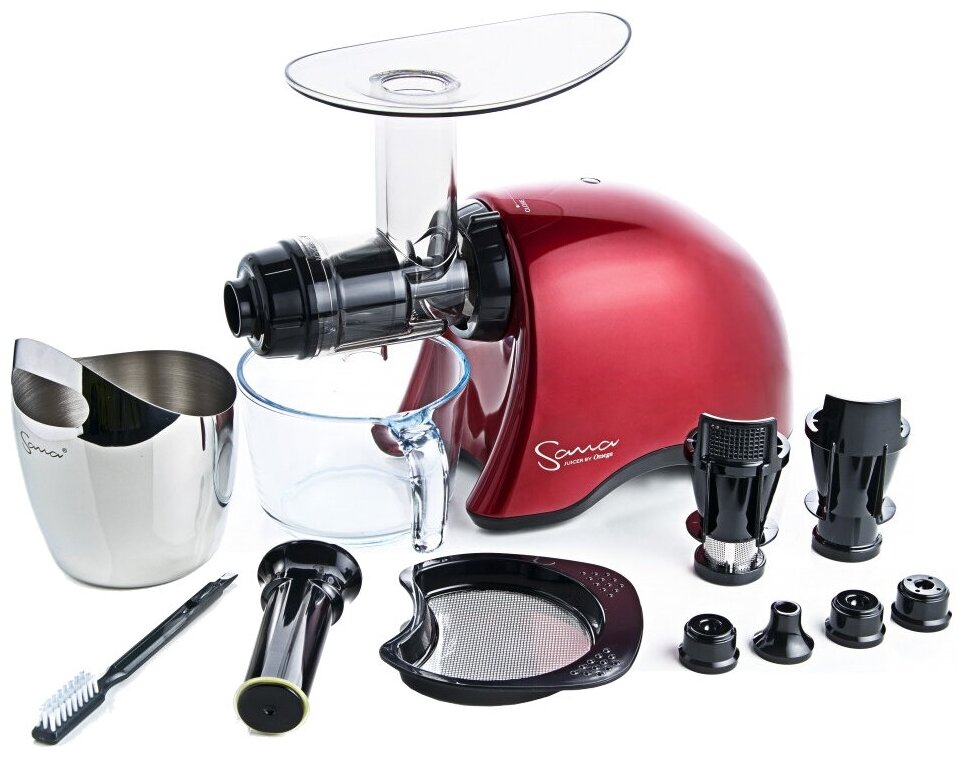 Sieve for homogenizer; nozzle for pasta / spaghetti; number of screws: 1; juice tank: glass; maximum rotation speed: 70 rpm; loading tray; cleaning brush