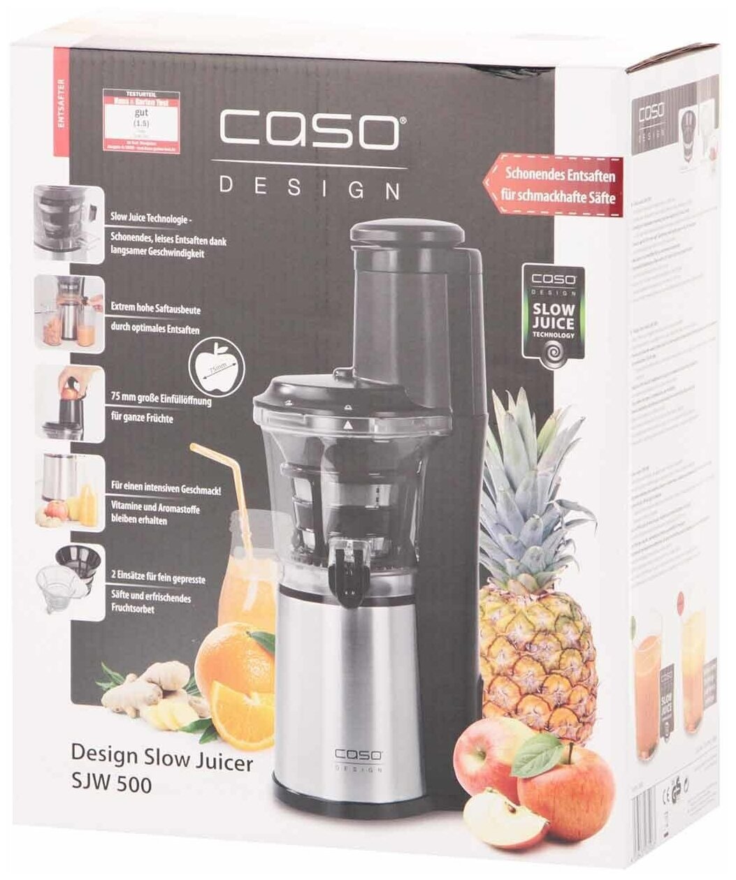 Type: auger, power: 150 W, type of auger juicer: vertical, mouth width: 75 mm, juice tank volume: 0.70 l, pulp tank volume: 0.70 l, number of speeds: 1, housing material: stainless steel