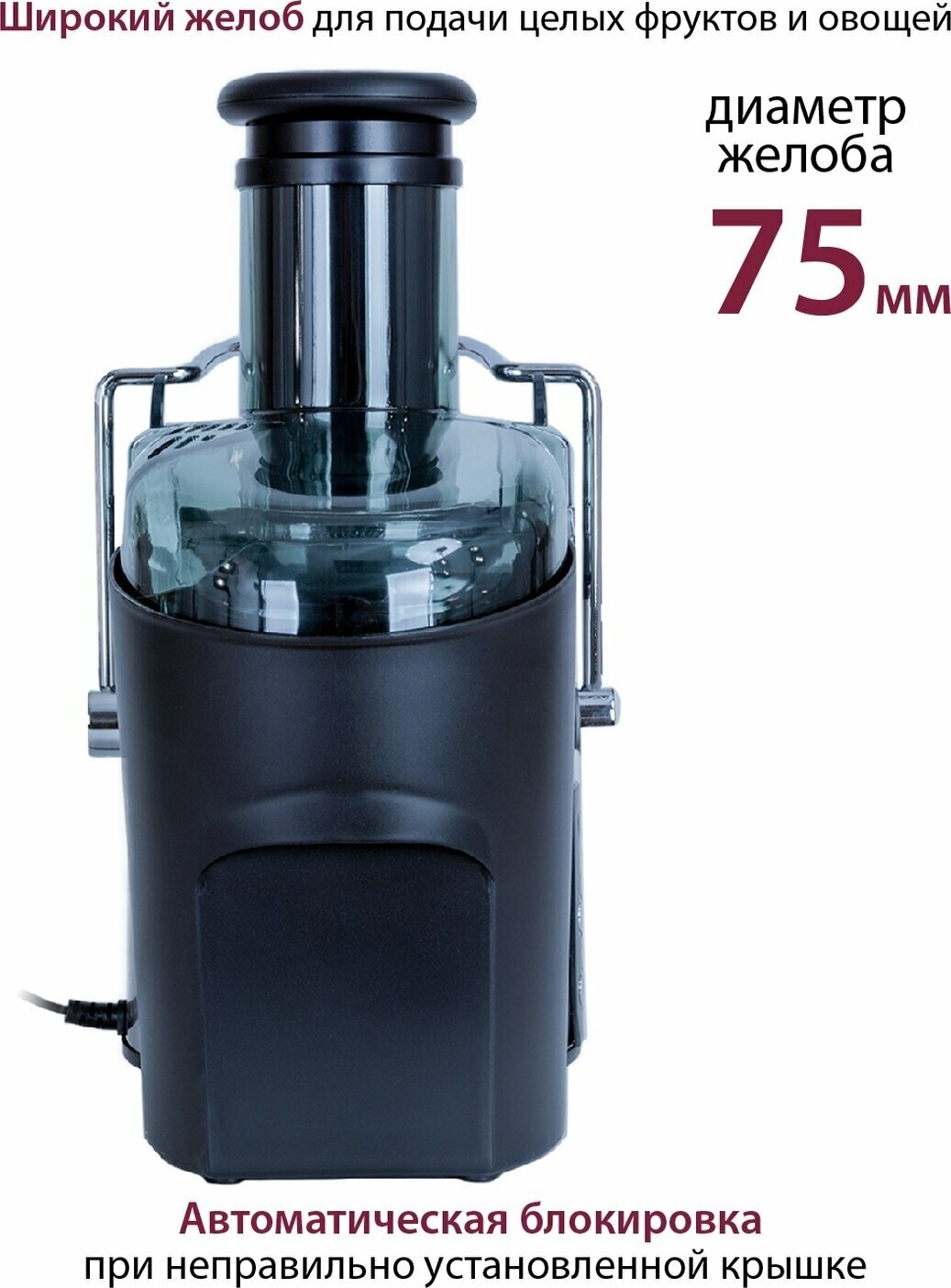 Description: Type: centrifugal, power: 1000 W, mouth width: 75 mm, juice tank volume: 1.10 l, number of speeds: 5, body material: stainless steel, plastic, features: overload protection, impulse mode, systems