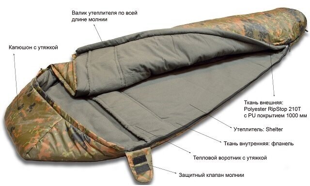 Three-season sleeping bag-cocoon, filling: synthetics 2-layer, comfort temperature: -5°С, zippering, pockets, compression bag, weight 1.6 kg