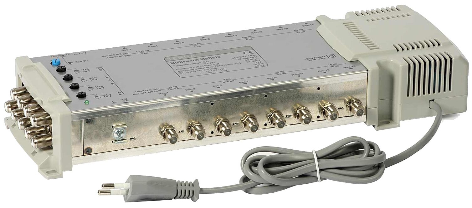 9 inputs 8 sat + 1 tv, 16 outputs, built-in power supply