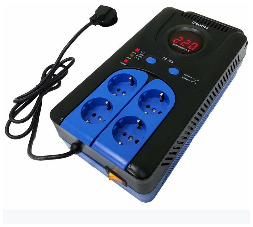Input voltage type: single-phase, stabilizer type: relay, location: floor, universal, min. input operating voltage: 120V, max. input operating voltage: 285 V, output sockets with stabilization: 4