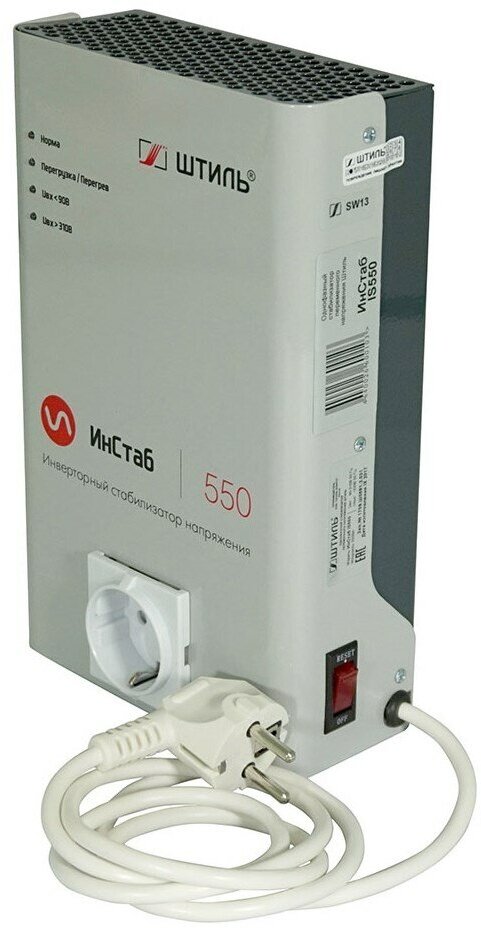 Complete set: voltage stabilizer IS550 1 pc, self-tapping screw 4.2x41 2 pcs, instruction manual 1 pc, warranty card 1 pc, surface marking template 1 pc; min. input voltage limit: 90 V; Max. input n