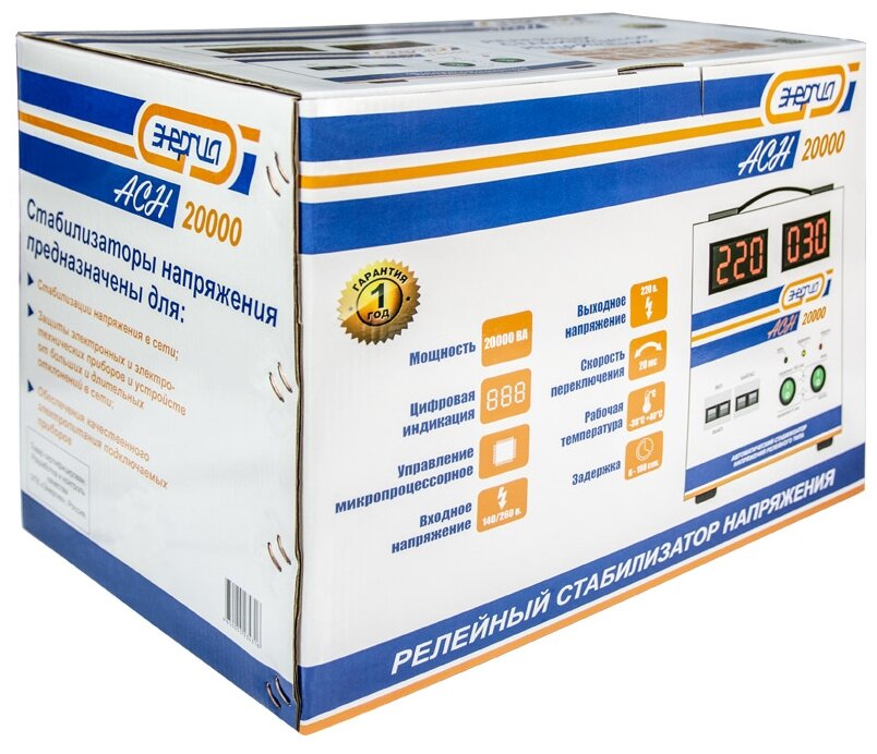 Input voltage type: single-phase, stabilizer type: relay, location: floor, min. input operating voltage: 140 V, max. input operating voltage: 260 V, error: 8%, noise level: 30 dB