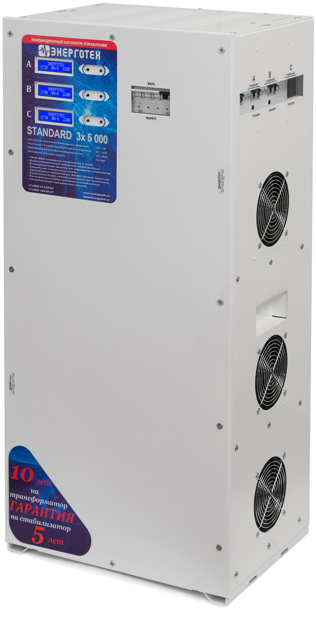 Type of input voltage: three-phase, type of stabilizer: electronic thyristor, location: floor, min. input operating voltage: 98 V, max. input operating voltage: 205 V, error: 3%