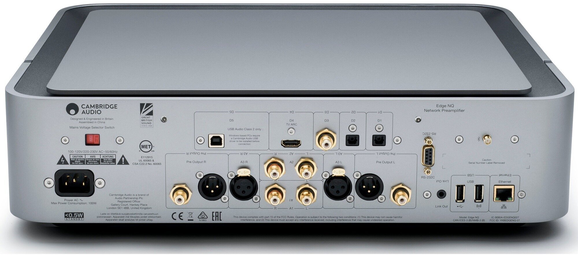 Ethernet 10/100, RS-232, USB 2.0 Type-A x 2, USB 2.0 Type-B, audio coaxial input, audio optical input x 2, HDMI output, PreAmp output, stereo audio output, stereo audio output balanced, output to headphones