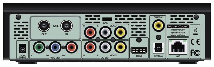 Ethernet 10/100, USB 2.0 Type-A x 2, USB 2.0 Type-B, stereo audio input, composite video input, HDMI output, coaxial audio output, optical audio output, stereo audio output, composite video output, component video output