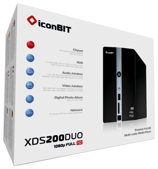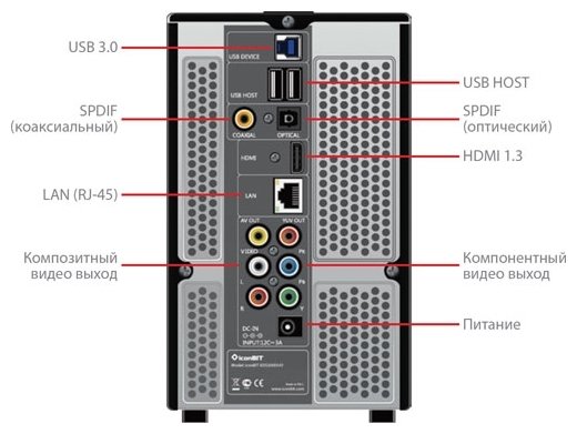 Device type: media player, maximum resolution: 1080p, interfaces: Ethernet 10/100/1000, USB 2.0 Type-A x 3, USB 3.0 Type-B, HDMI output, coaxial audio output, optical audio output, stereo audio output, video output composite, video output to