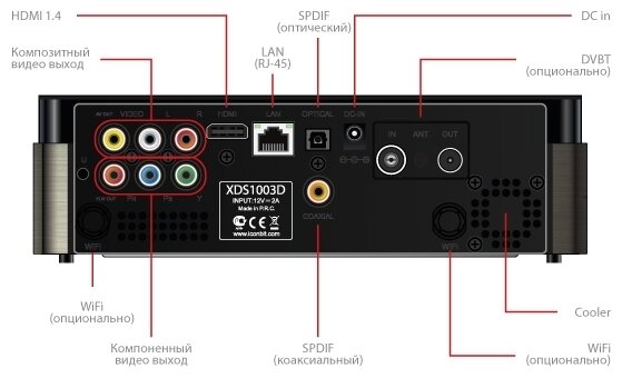 Device type: media player, maximum resolution: 1080p, interfaces: Ethernet 10/100, USB 2.0 Type-A x 2, USB 2.0 Type-B, HDMI output, coaxial audio output, optical audio output, stereo audio output, composite video output, video output com