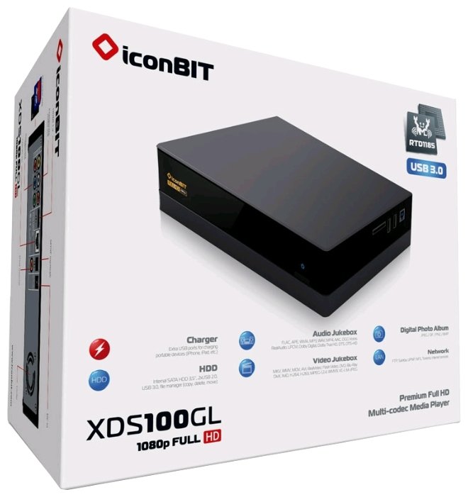 Device type: set-top box, maximum resolution: 1080p, interfaces: Ethernet 10/100, USB 2.0 Type-A x 2, USB 3.0 Type-B, HDMI output, coaxial audio output, optical audio output, stereo audio output, video output composite, video output