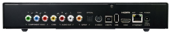 Device type: media player, maximum resolution: 1080p, interfaces: Ethernet 10/100, USB 2.0 Type-A x 2, USB 2.0 Type-B, HDMI output, coaxial audio output, optical audio output, stereo audio output, composite video output, video output com