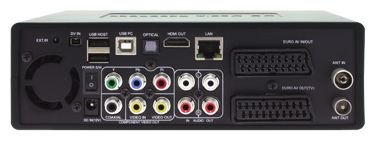 Ethernet 10/100, USB 2.0 Type-A x 2, USB 2.0 Type-B, stereo audio input, composite video input, HDMI output, SCART output, coaxial audio output, optical audio output, stereo audio output, composite video output, output video component