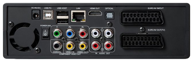 Ethernet 10/100, USB 2.0 Type-A x 2, USB 2.0 Type-B, stereo audio input, composite video input, HDMI output, SCART output, coaxial audio output, optical audio output, stereo audio output, composite video output, output video component